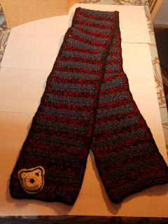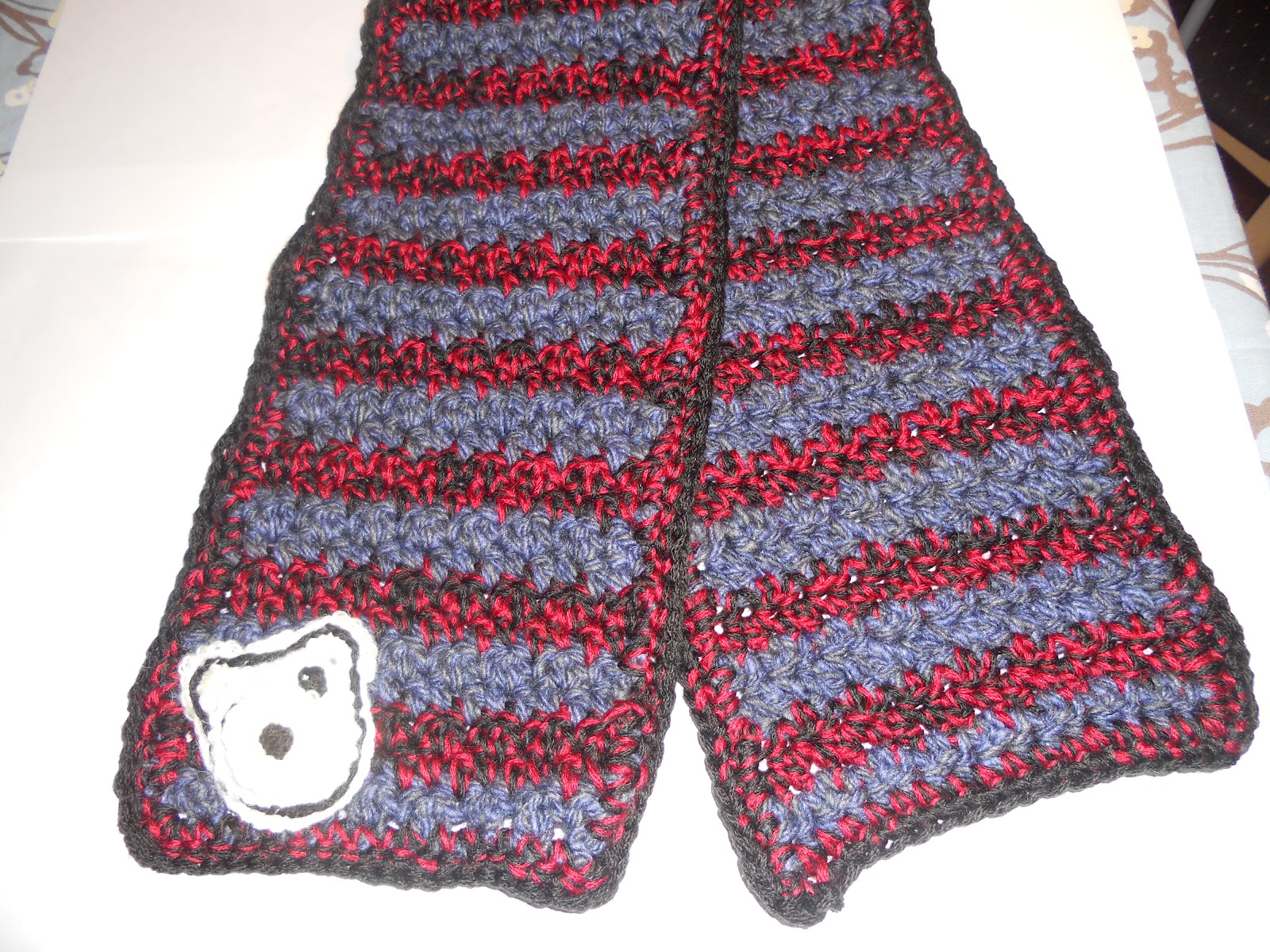 This was the first time trying to make something like this with the bear. I used a pattern but modified it so that it could work for the desired effect I was looking for. It seems that the original patter is now missing but I didn’t really go stitch by stitch by the pattern because I had something in mind and the pattern doing it the way it wanted just didn’t fit that criterea. I think my husband is very happy with his new scarf too. I’m excited about seeing him use it this coming winter too.