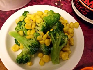 Steam the corn and broccoli. Season to taste as well as toss in small amount of butter for taste.