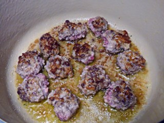 1. Split the sausage skin, squeeze out the meat, mix all of the sausage in with the ground beef. Make small meatballs.
