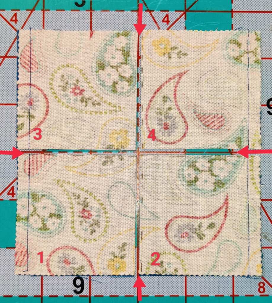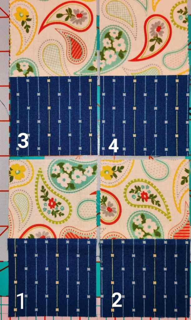 6. Now we will sew two together to create a four patch by rotating one in the opposite direction to create that four patch effect. Note: For each pair sewn together, when they are cut twice, there will be four 2 – 1/2 patch segments. I”m not sure how else to word that.