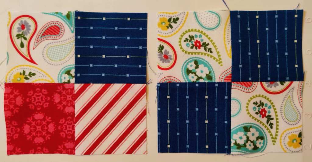 In the image above you will sew two half patches together to form a four patch unit. The image below shows two four patch units. One that I kept the colors together and the other having mixed them some. You can decide on which way you wish to do the four patch blocks.