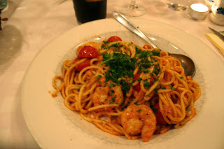 Spaghetti agli Scampi: Spaghetti with prawns, cherry tomatoes, parsley, white wine, olive oil, chilli and garlic.