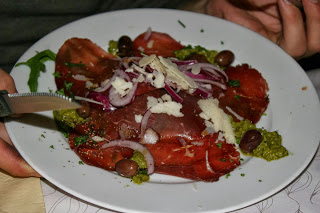 Carpaccio di Bresaola: Thinly sliced air-dried beef topside w / rocket salad and fresh Parmesan flakes. Serve with baguette and butter.
